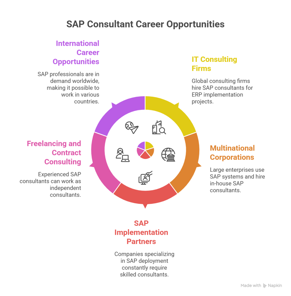 Numerous international consulting firms recruit SAP consultants for ERP implementation assignments. Notable examples include major technology consulting enterprises.